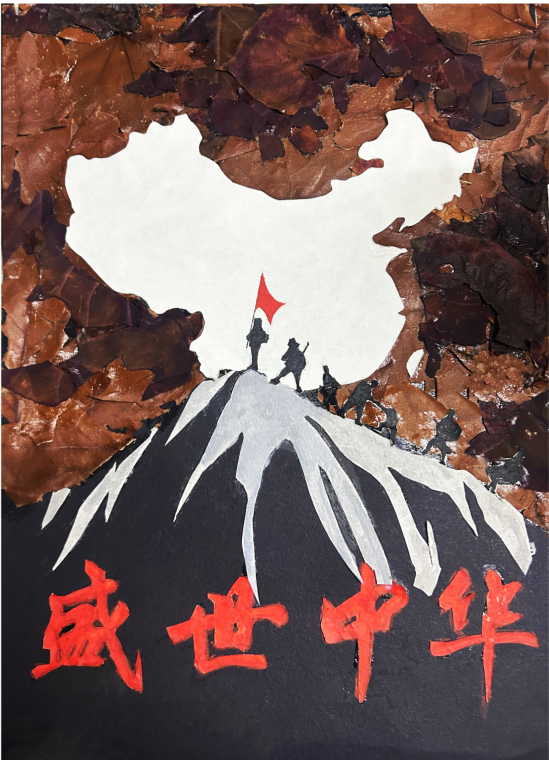 共有20余件作品进行了现场展示,同学们将在校园中收集到的各种颜色、各种形状的落叶进行创意拼接组合,制作出一幅幅充满想象力的作品。作品《致敬最可爱的人》以解放军战士为原型进行创作,运用了银杏叶、杨树叶、枫叶、樱桃树叶等色彩不同、形状各异的树叶,寓意着战士驻守边疆,保卫着国家安宁,民族团结,中华民族日益繁荣富强;作品《巨龙腾飞》用黄色、红色树叶拼贴成巨龙的形象,生动威猛,栩栩如生,龙身盘绕着天安门、天坛、75周年等意象,寓意着我们的祖国如一条腾飞的巨龙,巍然屹立在世界民族之林,展示着雄壮的大国气象;作品《盛世中华》用落叶拼贴和手绘共同创作出一幅壮丽画卷,画面中,一队人正在齐心协力攀登高山,山顶上红旗飘扬,象征着中国人民在党的领导下,团结一心、勇攀高峰,传达出一种强烈的爱国主义情怀和奋斗精神;其他作品也都各具创意,展示了对于祖国75周年华诞的深切祝福,对祖国深深的眷恋和热爱,同时也展示了对美的创作与热情,提醒人们珍惜自然、保护环境,为守护祖国的美丽山河做出贡献。