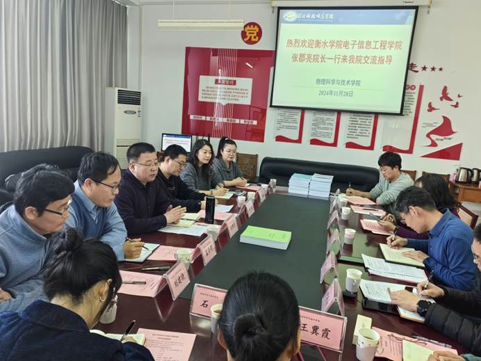 2024年11月28日,衡水学院电子信息工程学院院长张郡亮、副院长崔凌、物理学教研室主任杜晶晶、教学科研办主任孟令辉、专业教师刘建晓、专业教师韩炎桢一行6人来我院调研交流。我院党政领导、教学部主任、学生工作人员接待了衡水学院一行。
