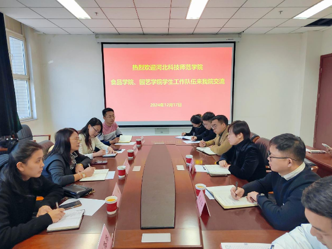 2024年12月17日,食品科技学院、园艺科技学院学生主管领导及专职辅导员组成交流考察团,赴河北科技大学食品与生物学院交流考察学生工作情况。河北科技大学食品与生物学院学生工作主管领导及专职辅导员参加了此次交流。