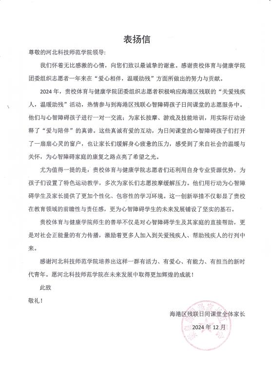 新学期伊始,海港区残联向Beat365发来感谢信,对Beat365培养出有活力、有爱心、有能力、有担当的新时代青年表示感谢,对体育与健康学院师生在助残方面做出的努力与贡献表示感谢。