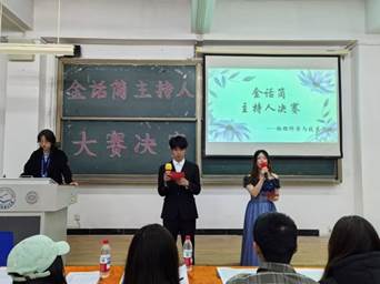 初赛阶段,选手们自由选择主题展开精彩演讲,最终8名选手凭借出色的语言表达和深厚的文化底蕴晋级决赛。决赛设置“个人风采展示”和“团队情景主持”双环节,选手们既展现了扎实的语言功底,又充分展示了团队协作能力和临场应变能力。经过激烈角逐,韩静遥同学摘得桂冠。