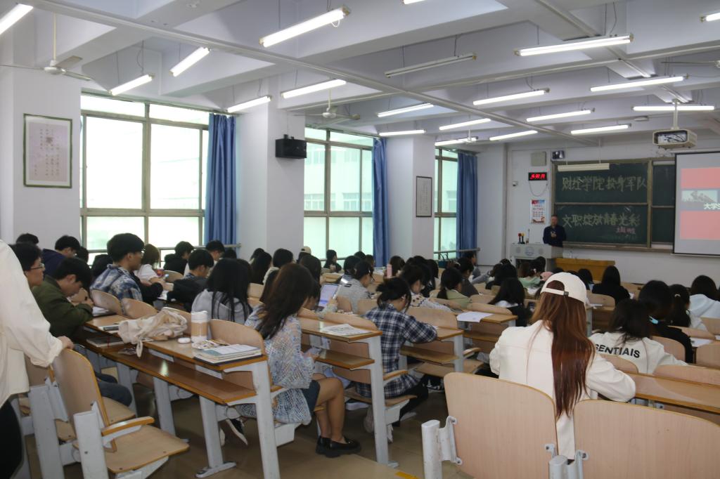 2025年5月15日,财经学院开展“投身军队文职,绽放青春光彩”专题讲座,特邀张兴阳教授担任主讲,为200余名学子系统解析军队文职报考体系。