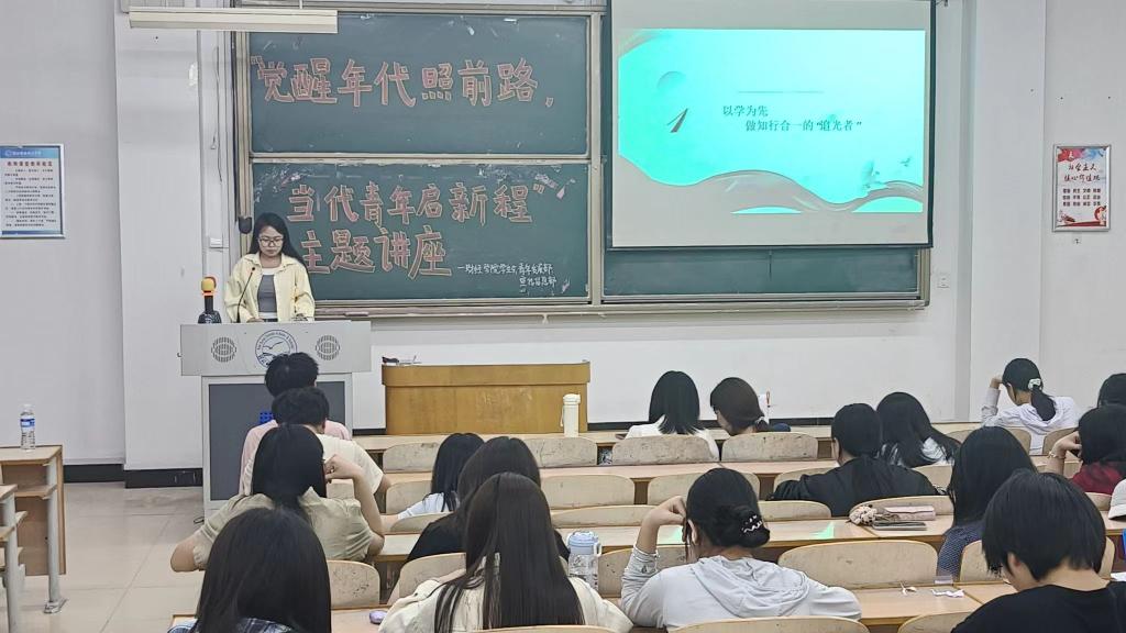 近日,财经学院财教学生党支部面向学院学生开展“觉醒年代照前路,当代青年启新程”主题讲座。财教学生党支部党员、五四奖章获得者22级财务会计教育专业的李冰钰同志担任主讲。