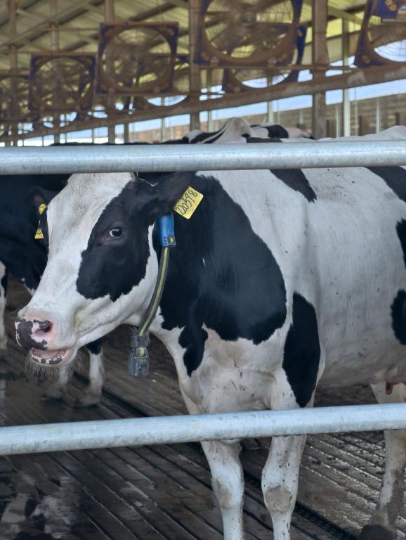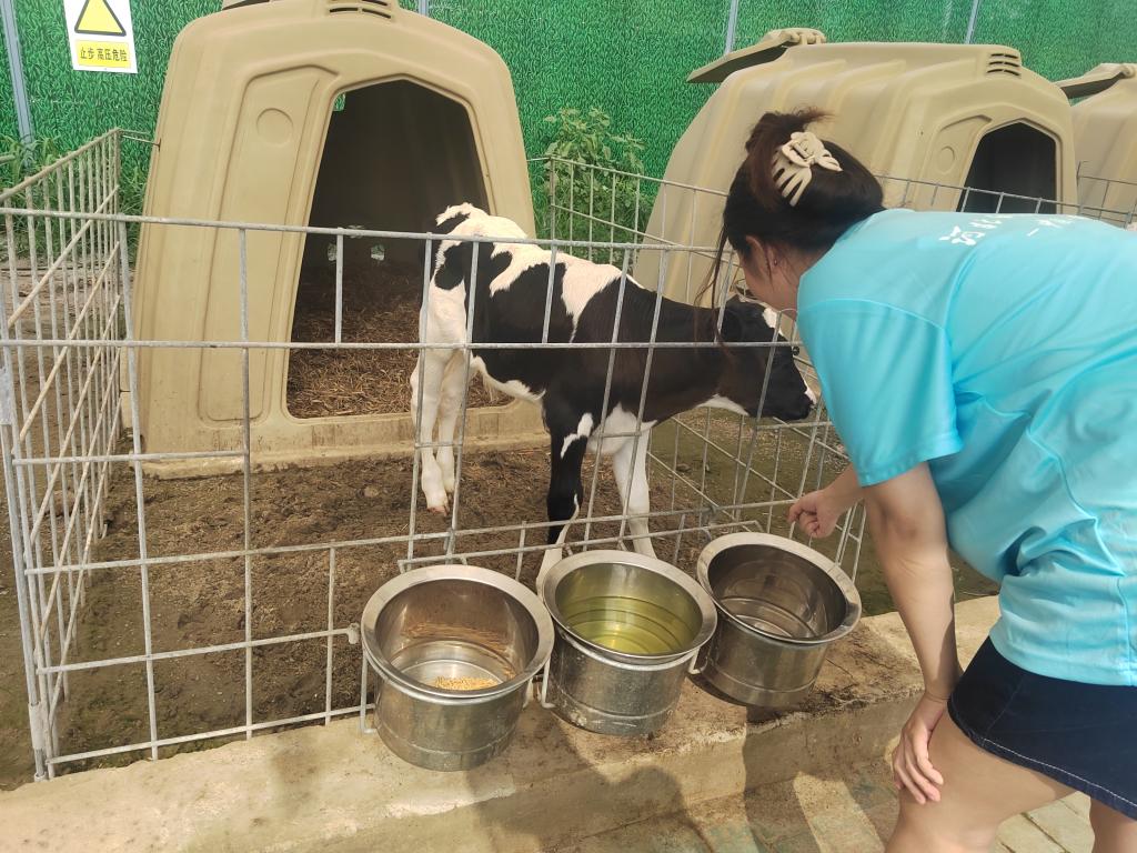 泌乳牛舍参观实践过程中,大家对牛群佩戴的智能检测项圈产生浓厚兴趣——通过项圈实时采集的体温、采食、活动量等数据,能帮助管理人员精准掌握牛群健康状态,这一“科技+养殖”的模式让队员们直观感受到现代农业的智能化转型。随后,大家来到了犊牛岛。技术人员介绍,犊牛岛采用单体隔离设计,既能有效避免幼牛间的疾病传播,又能保证每头犊牛获得充足的光照和活动空间,为其提供最适宜的生长环境。犊牛出生后半小时内要饮用4升初乳,之后便会与母牛分开,来到这里由专人照料喂养。队员们注意到每个犊牛岛旁都挂着一张详细的“成长档案”,记录着犊牛的出生日期、体重、每日进食量等信息。这里群山环抱,得天独厚的地理条件造就了凉爽宜人的小气候,为对温度敏感的奶牛提供了理想的栖息之所。