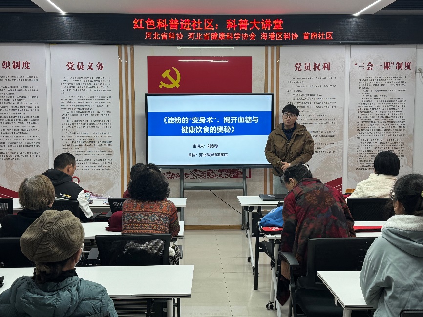2025年10月25日,为积极响应国家“健康中国”战略,普及食品营养健康知识,由河北省科学技术协会、河北省健康科学学会联合组织的“红色科普进社区:科普大讲堂”系列活动走进多个社区。食品科技学院刘素稳教授带领团队师生积极参与,为海港区首府社区居民带来了一场题为《淀粉的“变身术”:揭开血糖与健康饮食的奥秘》的科普讲座。