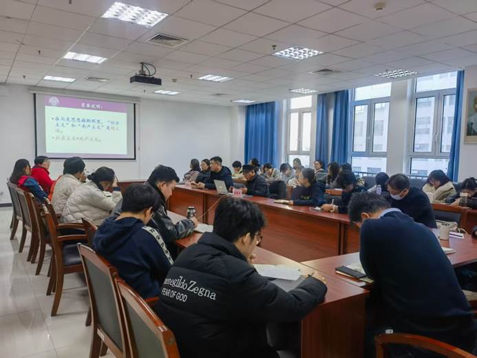 活动伊始,马克思主义学院教师与东北大学秦皇岛分校马克思主义学院师生共同聆听了南开大学马克思主义学院博士生导师、教授石镇平作的《关于科学社会主义基本原则研究的几个问题》报告。他结合多年教学与科研经历,从近二十年科学社会主义基本原则研究的成绩和问题、科学社会主义基本原则的问题逻辑与阶段逻辑、建构科学社会主义基本原则体系内在逻辑的基本原则、新时代中国共产党对科学社会主义基本原则的继承与发展等四个方面进行了讲解与阐述,分享了自己的心得、感悟。随后,大家就如何辨别当今时代不同社会主义流派;如何协调学术研究与课堂教学的关系;如何处理马克思主义理论、中共党史党建学、科学社会主义等不同学科概念术语的联系与区别展开了交流与讨论,达成了一致意见。