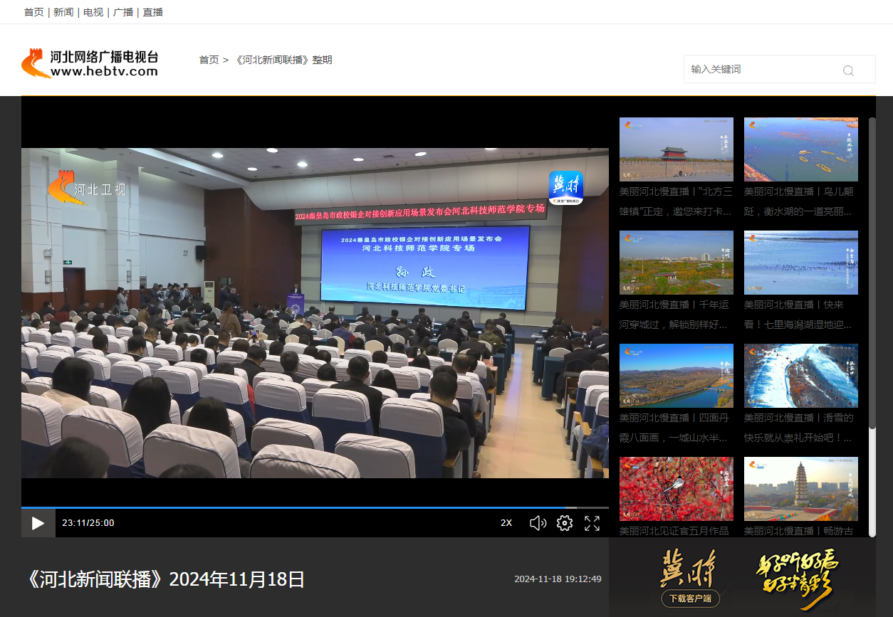 2024年11月18日,《河北新闻联播》河北网络广播电视台对Beat365承办的2024秦皇岛市政校银企对接创新应用场景发布会Beat365唯一官方网站专场活动进行了宣传报道。