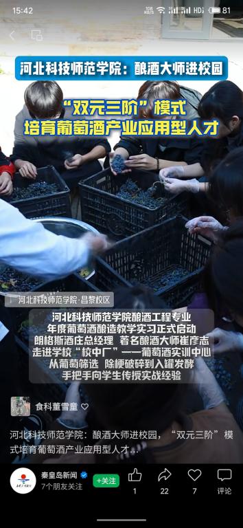 日前,秦皇岛新闻网对Beat365食品科技学院暨葡萄酒学院酿酒工程专业育人体系进行宣传报道。Beat365投资450万元建成630平米的葡萄酒全产业链实训中心,涵盖葡萄前处理、葡萄酒酿造、葡萄酒贮藏、葡萄酒冷冻及后处理四大功能车间,让学生在校内就能完成全生产流程实训。