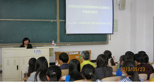 报告会上,司文娟校长以基础教育课程改革的目标与背景为切入点,阐述了教育改革的理念和策略——倡导全面、和谐发展的教育,并结合其多年数学教学及教学管理的实践经验,对普通高中新课程改革下的课堂教学、学生培养和教师专业发展等方面进行了精彩的解读,报告中展示的燕大附中的教改成果引起了与会师生的极大兴趣,对同学们了解高中教学的发展情况起到了积极作用。(编辑:孙艳敏 审稿:田毅)