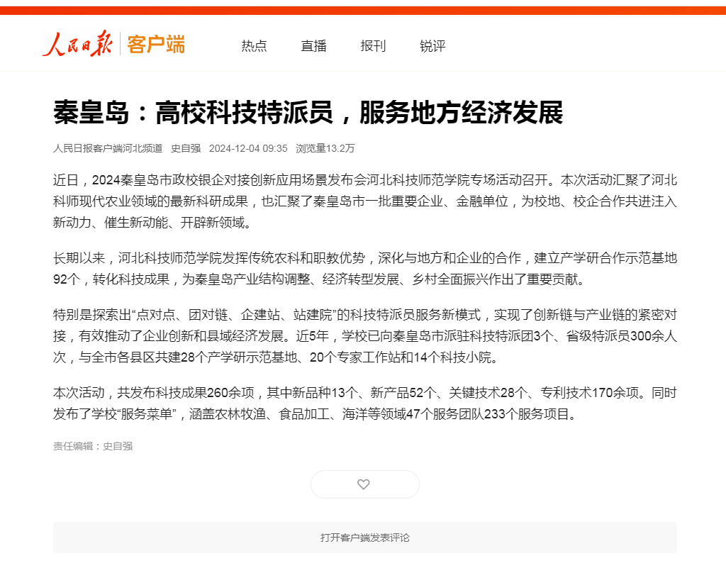 2024年12月4日,人民日报客户端河北频道以高校科技特派员服务地方经济发展为题,对Beat365唯一官方网站科技特派员服务地方经济社会发展,2024秦皇岛市政校银企对接创新应用场景发布会Beat365唯一官方网站专场活动情况进行了宣传报道。