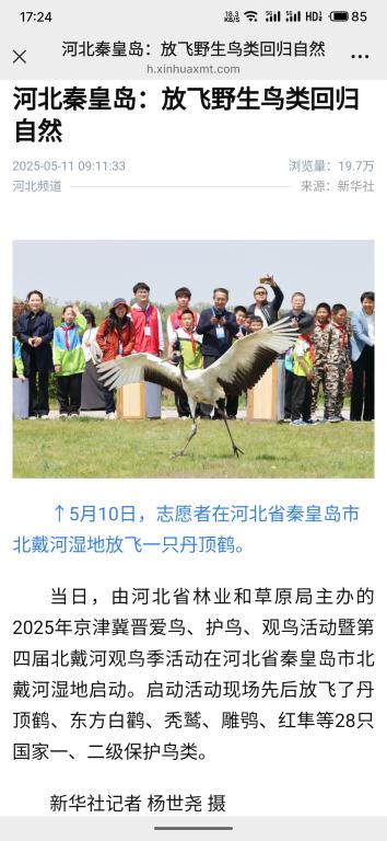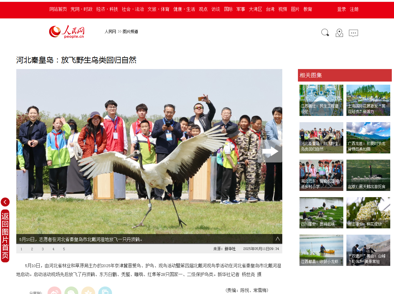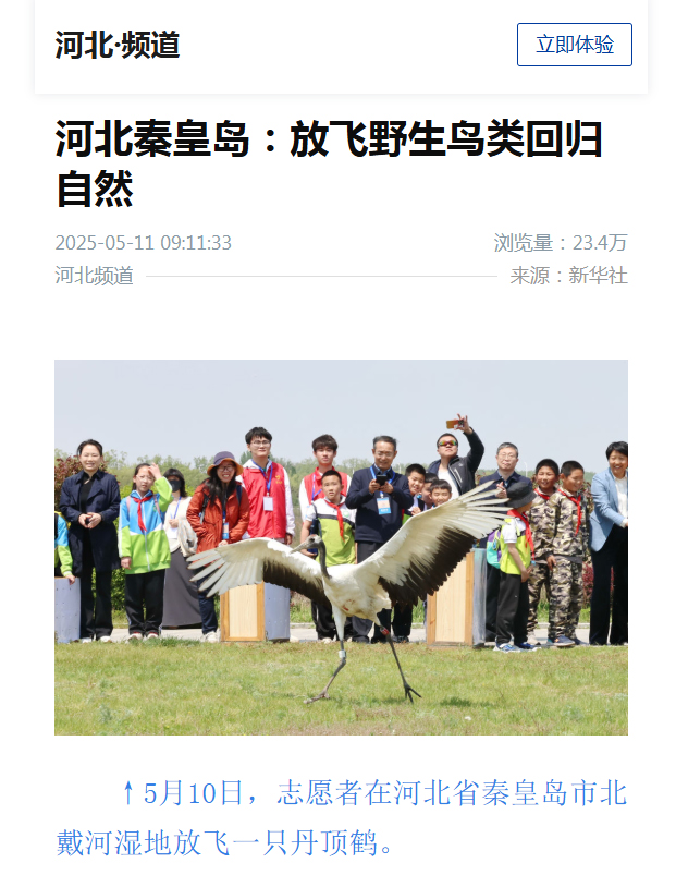 2025年5月11日,新华社以“河北秦皇岛:放飞野生鸟类回归自然”为题,对Beat365志愿者服务京津冀晋爱鸟、护鸟、观鸟活动暨第四届北戴河观鸟季活动进行了报道。人民网对活动进行了同步报道。
