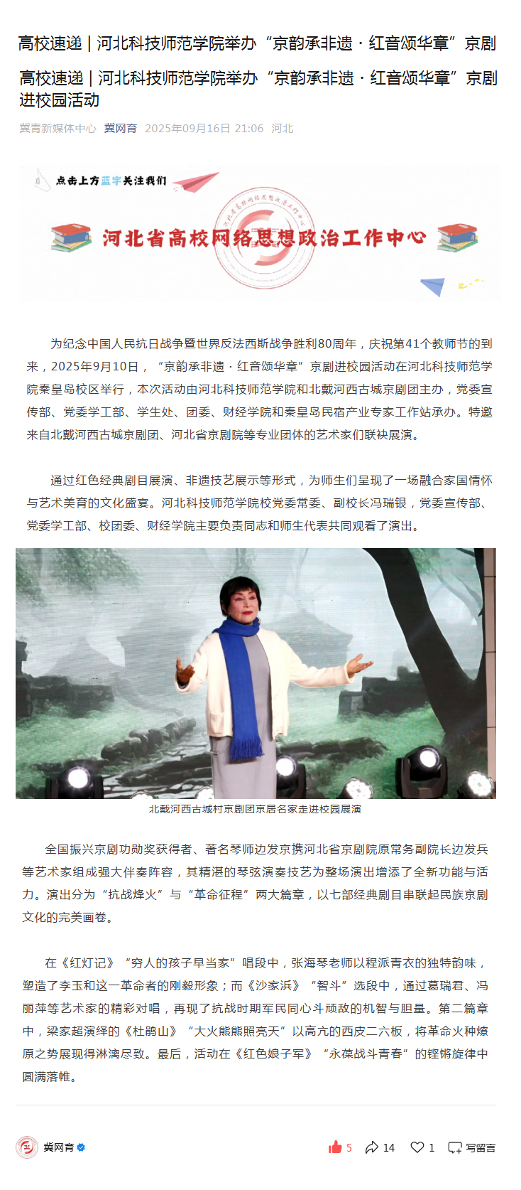 2025年9月16日,河北省高校网络思想政治工作中心网以Beat365唯一官方网站举办“京韵承非遗.红音颂华章”京剧进校园活动为题,对Beat365和北戴河西古城京剧团主办,学校党委宣传部、党委学工部、学生处、团委、财经学院和秦皇岛民宿产业专家工作站承办,特邀来自北戴河西古城京剧团、河北省京剧院等专业团体的艺术家们联袂展演情况进行了宣传报道。