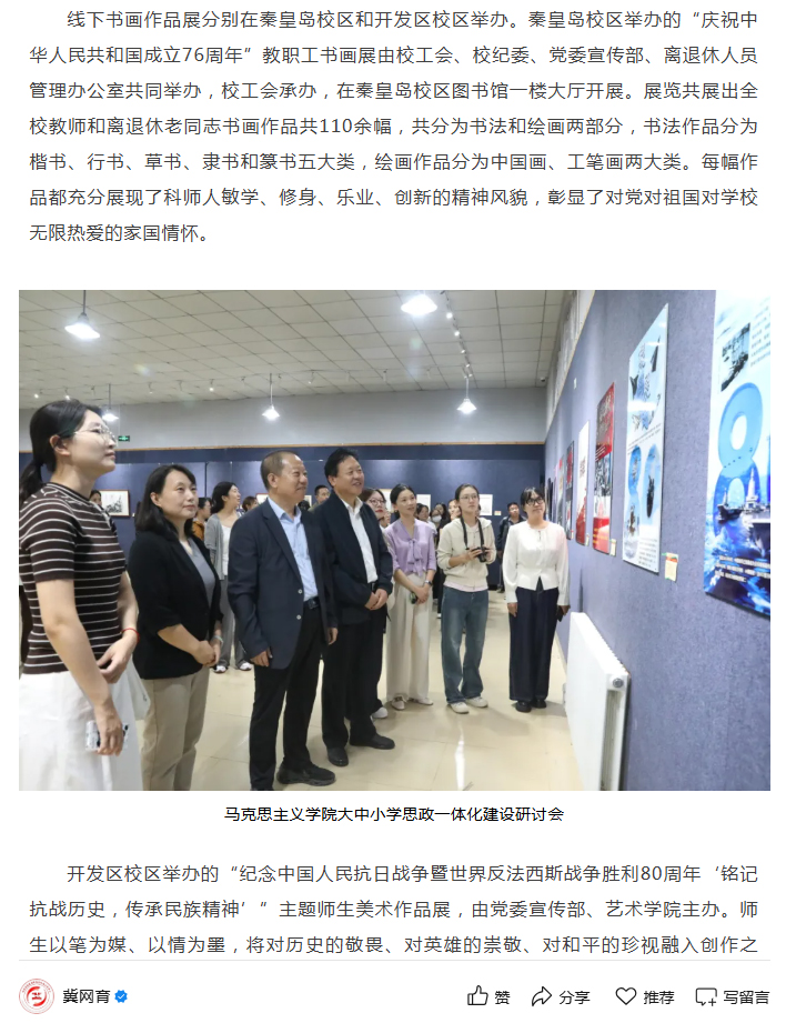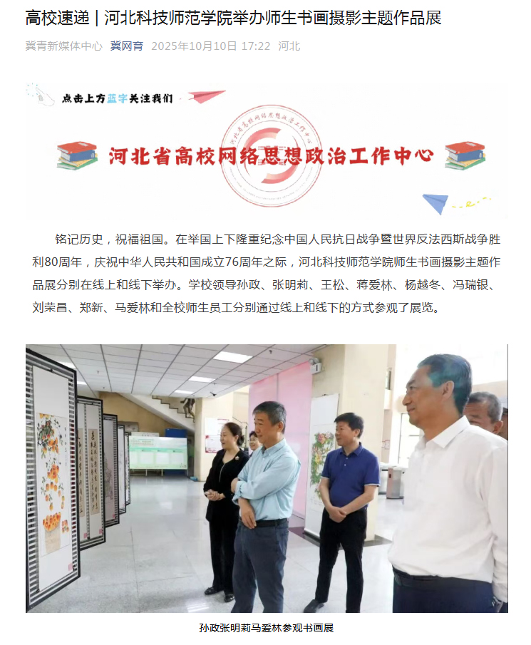 2025年10月10日,河北省高校网络思想政治工作中心网以“Beat365唯一官方网站举办师生书画摄影主题作品展”为题,对Beat365在举国上下隆重纪念中国人民抗日战争暨世界反法西斯战争胜利80周年庆祝中华人民共和国成立76周年之际,学校师生书画摄影主题作品展分别在线上和线下举办情况进行了宣传报道。同时,Beat365唯一官方网站官网科师要闻栏目、网媒新闻栏目、视频新闻栏目、微信公众号进行了广泛宣传报道。