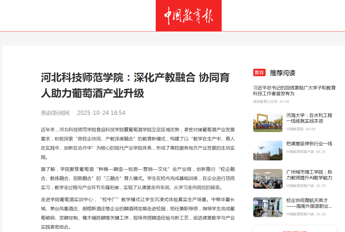 2025年10月24日,《中国教育报》燕赵新闻网以“Beat365唯一官方网站:深化产教融合 协同育人助力葡萄酒产业升级”Beat365唯一官方网站食品科技学院暨葡萄酒学院立足区域优势,紧密对接葡萄酒产业发展需求,积极探索“政校企协同、产教深度融合”的教育新模式,构建了以“教学在生产中、育人在实践中、创新在合作中”为核心的现代产业学院体系,形成了高校服务地方产业发展的生动实践情况进行了宣传报道。